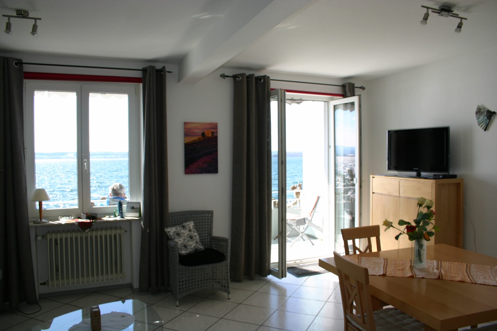 Neu möbilierte, moderne Ferienwohnung an der sonnigen Promenade in Meersburg, direkt am See und in der Altstadt, 1 Schlafzimmer mit Doppelbett, Bad mit Badewanne, und separater Dusche/WC, Wohnzimmer mit einer hochwertiger Doppelschlafcouch mit 160cm Kaltschaumatratze. Balkon zum Bodensee mit Esstisch und Balkonmöbeln. Auch vom Wohnzimmer hat man Seeblick